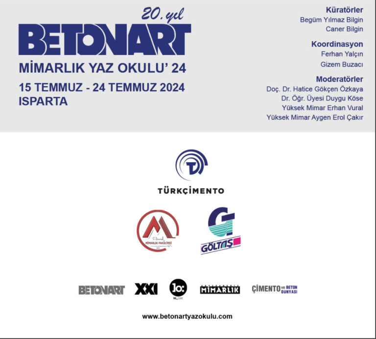 TÜRKÇİMENTO’nun düzenlediği BETONART Mimarlık Yaz Okulu Programı’nın 20’ncisi bu yıl “Timeless/Zamansız” temasıyla Isparta’da Süleyman Demirel Üniversitesi Mimarlık Fakültesi iş birliğiyle 15-24 Temmuz tarihleri arasında gerçekleşecek. Göltaş Çimento ana sponsorluğunda düzenlenen 2024 BETONART Mimarlık Yaz Okulu, üniversitelerin Mimarlık, İç Mimarlık ve Güzel Sanatlar Tasarımı bölümlerinde okuyan ve 4. Sınıfa geçen öğrencilere açık olacak.