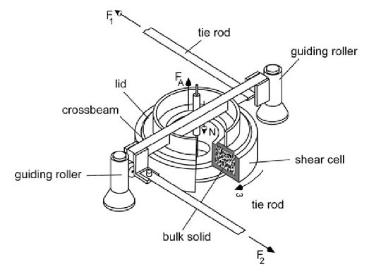 Kayma gerilimi hücresi yöntemini benimseyen ve ön plana çıkmış iki adet ticari test cihazı bulunmaktadır. Bunlardan birincisi Dr. Dietmar Schulze’nin bir haslka kayma gerilimi test cihazı (RST-XS) ve diğeri ise Brookfield Engineering Laboratories Inc.’den bir toz akış test cihazıdır (PFT) (Şekil 3). PFT, halka ve Jenike kayma gerilimi test tekniklerini kullanan ASTM D6128 test prosedürüne uygundur, RST ise ASTM 6773 test prosedürüne uygundur. Her ikiside hem endüstriyel hem de araştırmalarda yaygın olarak kullanılan test cihazlarıdır. RST ve PFT için temel ölçüm prensibi, tozun akma eğrisini ölçmektir (Şekil 4); bu da tozun konsolidasyondan sonra akması için gerekli gerilimi temsil eder. Bir Mohr gerilme çemberi, konsolidasyon sırasında toz içindeki gerilme durumunu temsil eder (Şekil 4a) ve bu nedenle konsolidasyonun ana asal gerilmesi σ1 tanımlanır. Orijinden geçen başka bir Mohr çemberi, sınırsız sıkıştırma altındaki gerilme durumu tanımlanır ve bu nedenle sınırsız akma dayanımını σC tanımlanır. Ana asal konsolidasyon gerilmesi σ1 ve sınırsız akma dayanımı σC‘nin oranı, akış faktörünü/akıcılık indeksini (ffC) (Denklem 4) verir.