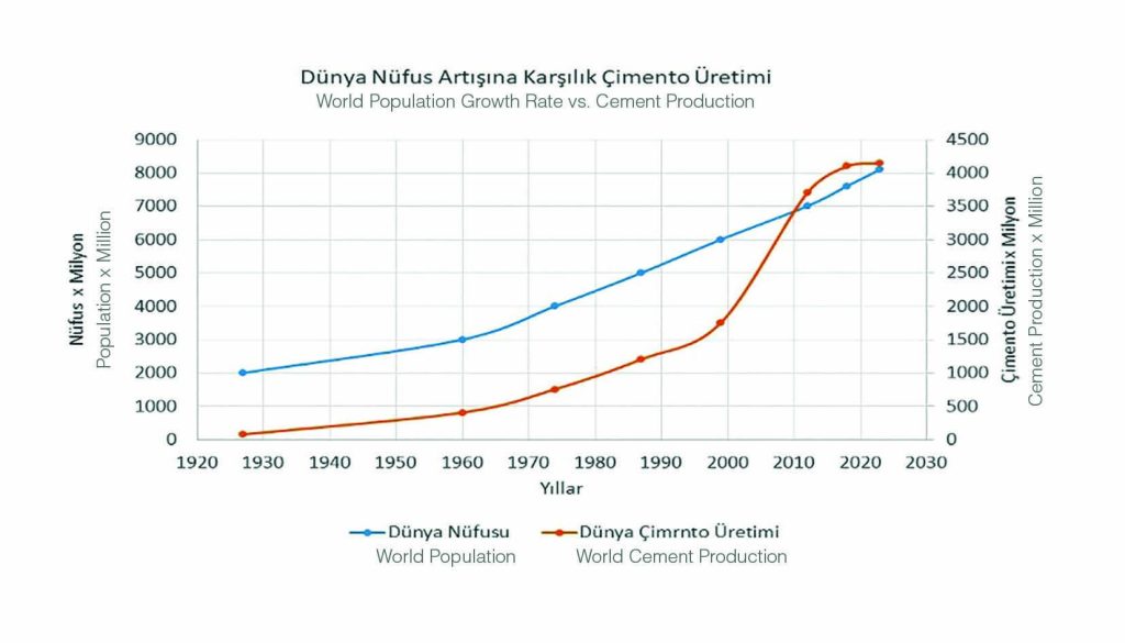 Tarih boyunca medeniyetlerin büyümesi ve gelişmesi, doğası gereği nüfus artışı ve çimento gibi temel yapı malzemelerinin kullanımıyla bağlantılı olmuştur. Şekil 1’den de görülebileceği gibi nüfus artışına bağlı olarak da çimento üretimi artış göstermektedir. İnsan toplumları genişledikçe ve kentleştikçe altyapı, konut ve anıtsal yapılara olan talep artmıştır; bu da inşaat uygulamalarının evrimini ve çimentonun temel malzeme olarak yaygın şekilde benimsenmesini sağlamıştır.